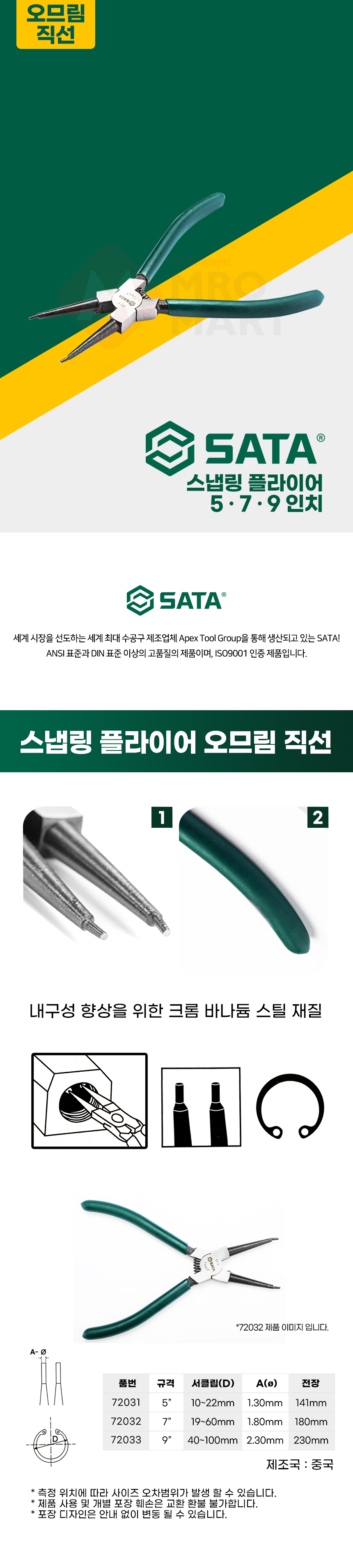 사타 스냅링 플라이어 오므림 직선 72033 9인치 수공구