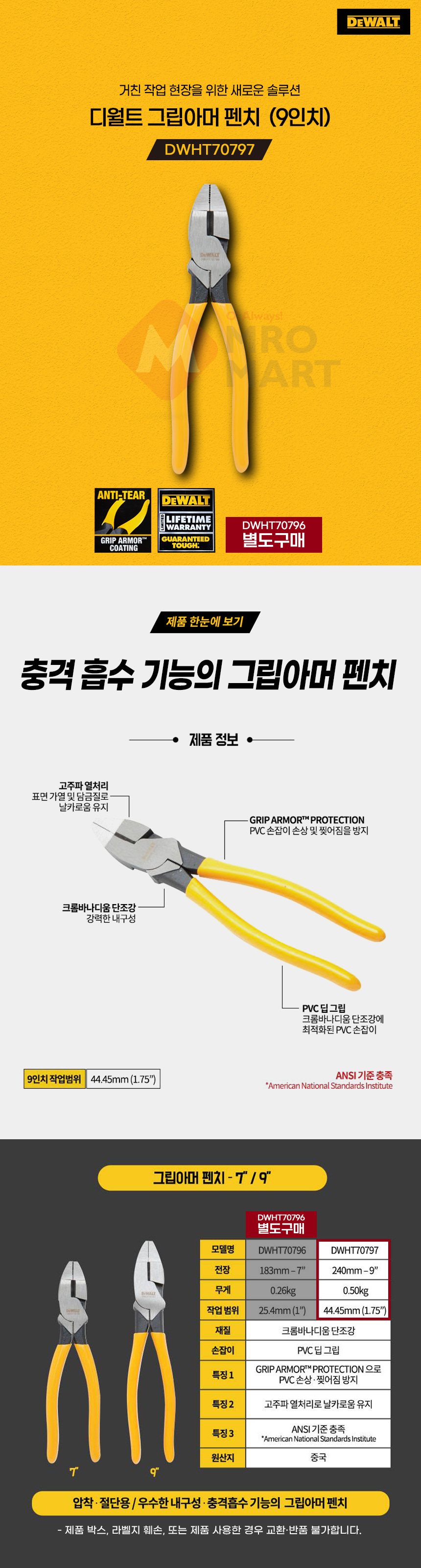 디월트 DWHT70797 그립아머 펜치 뺀찌 플라이어 9인치 수공구