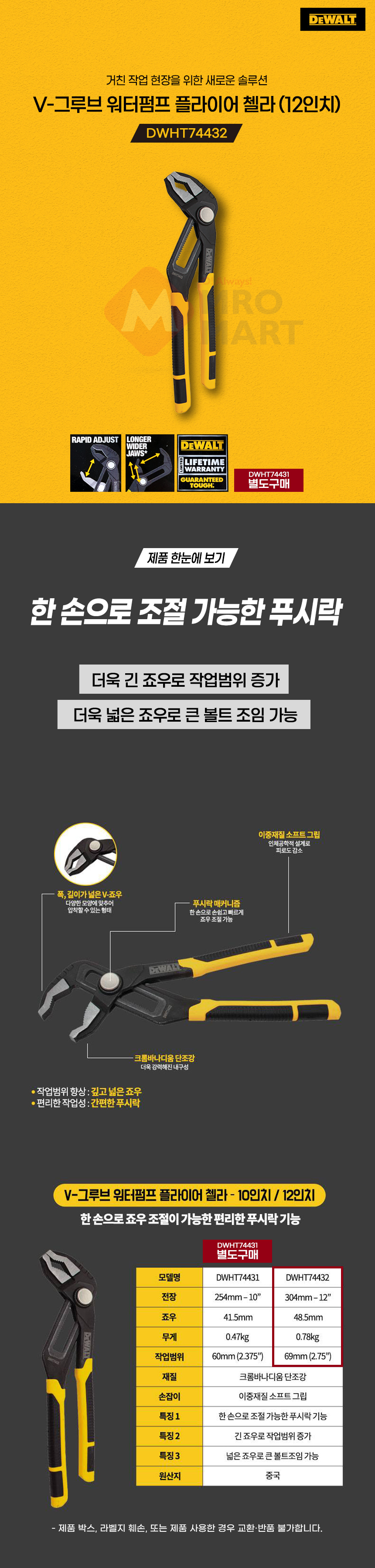 디월트 DWHT74432 V 그루브 워터펌프 플라이어 첼라 12인치 배관 작업 수공구