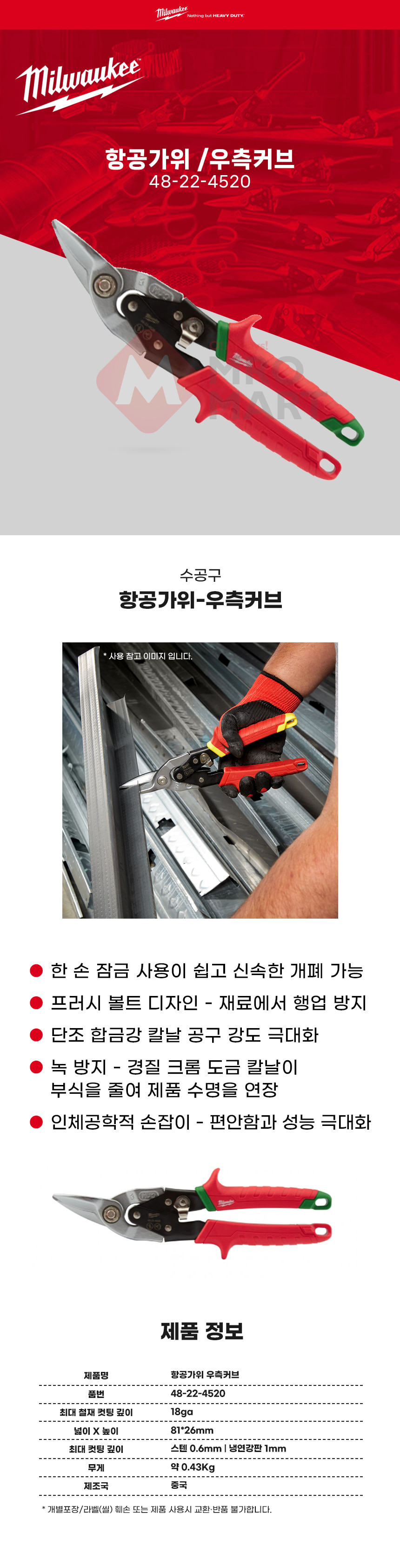 밀워키 항공 가위 우측 커브 48-22-4520 함석 철판 다용도 절단 컷팅