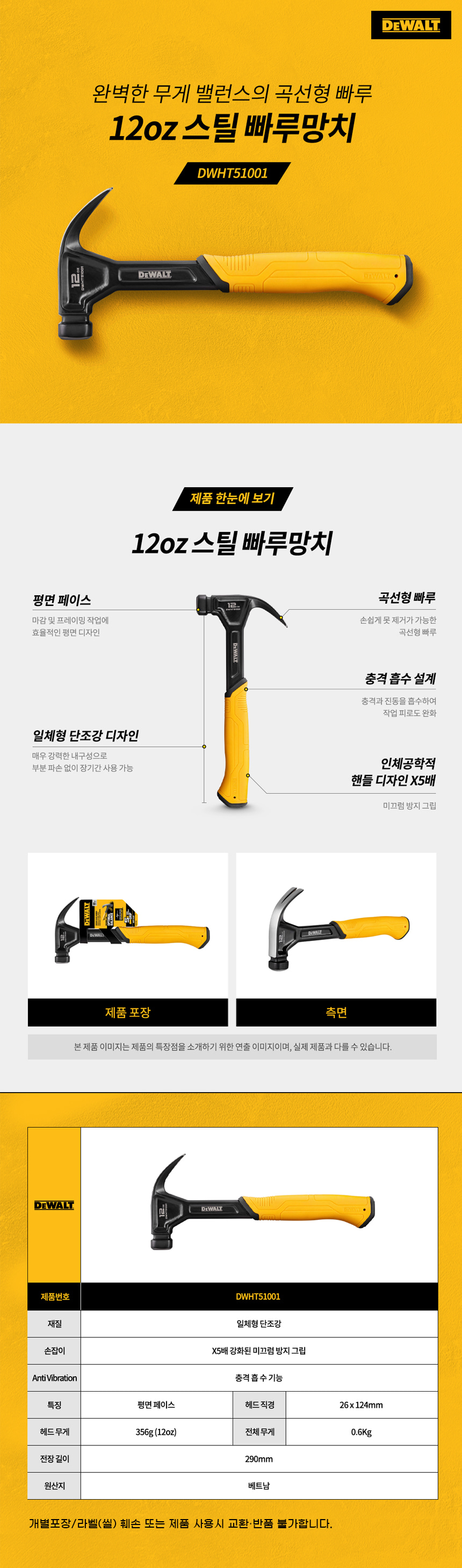 디월트 DWHT51001 스틸 빠루 망치 곡선형 290mm 0.6kg