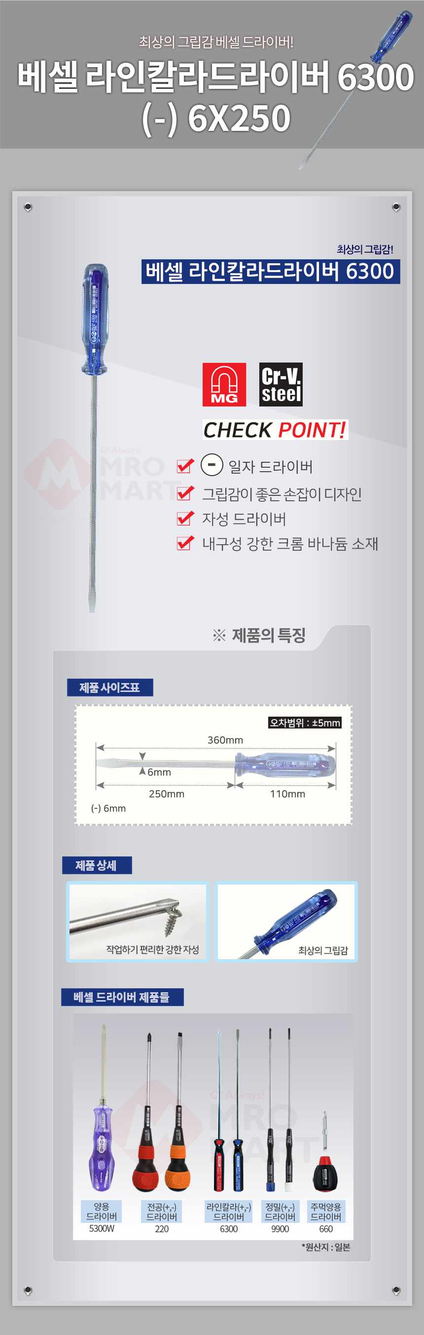 베셀 라인칼라드라이버6300(-) 6X250 자성드라이버 마그네틱 수공구 일자드라이버