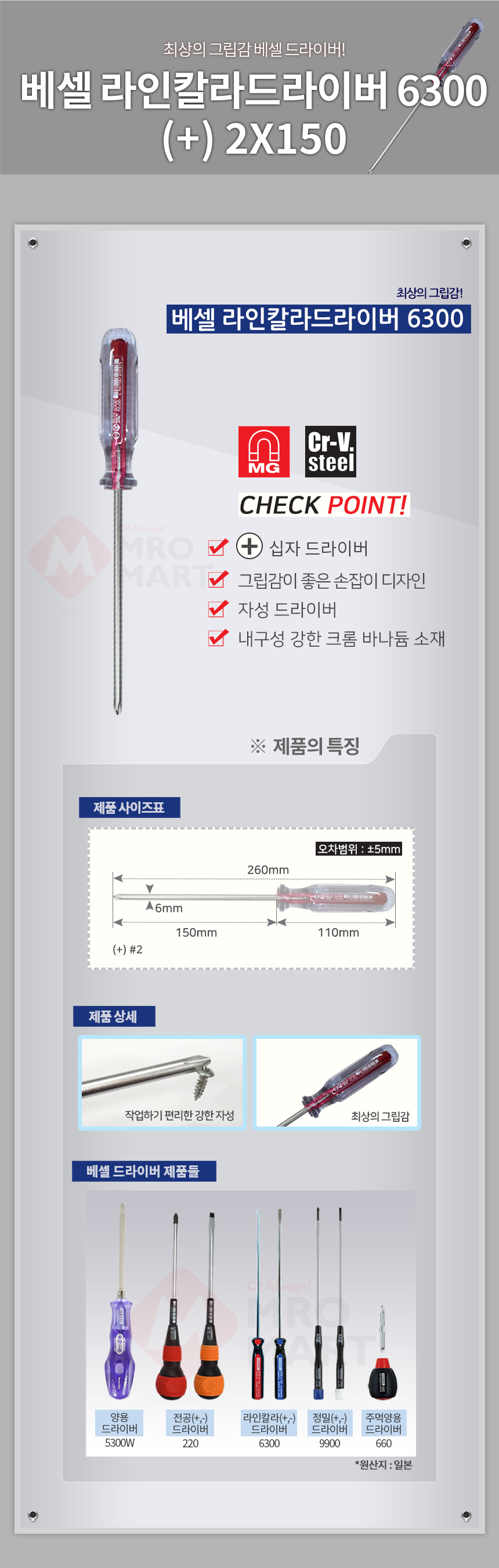베셀 라인칼라드라이버6300(+) 2X150 자성드라이버 마그네틱 수공구 십자드라이버
