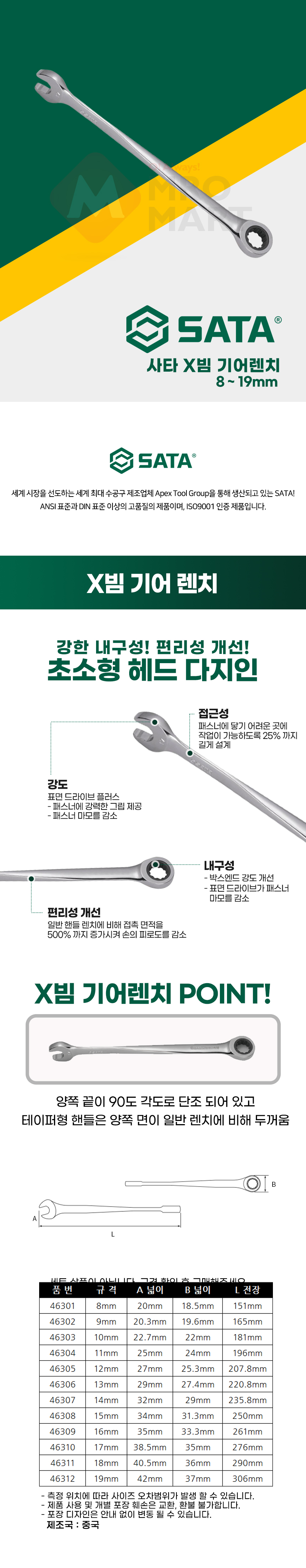 사타 X빔 기어 렌치 46307 14mm 라쳇 스패너 깔깔이 플라이어 수공구