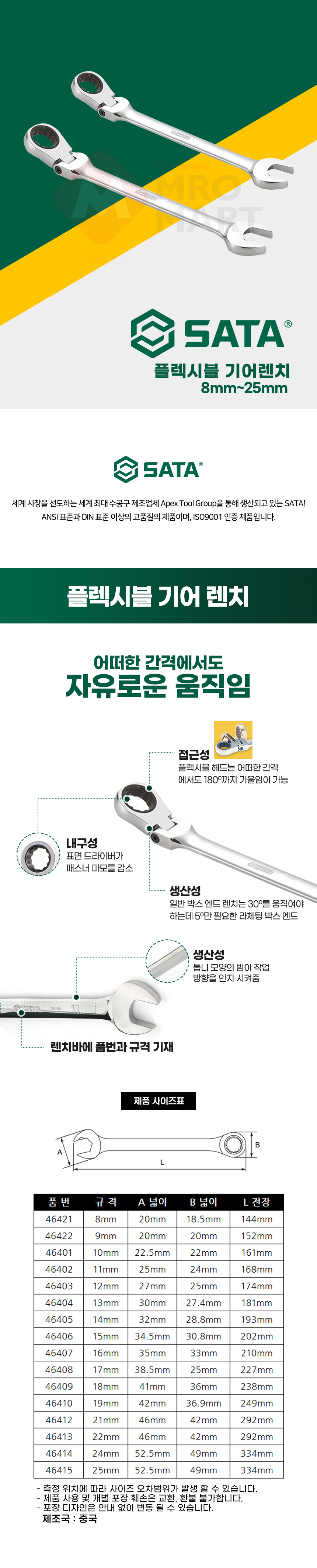 사타 플렉시블 기어 렌치 46410 19mm 깔갈이 스패너 라쳇 수공구
