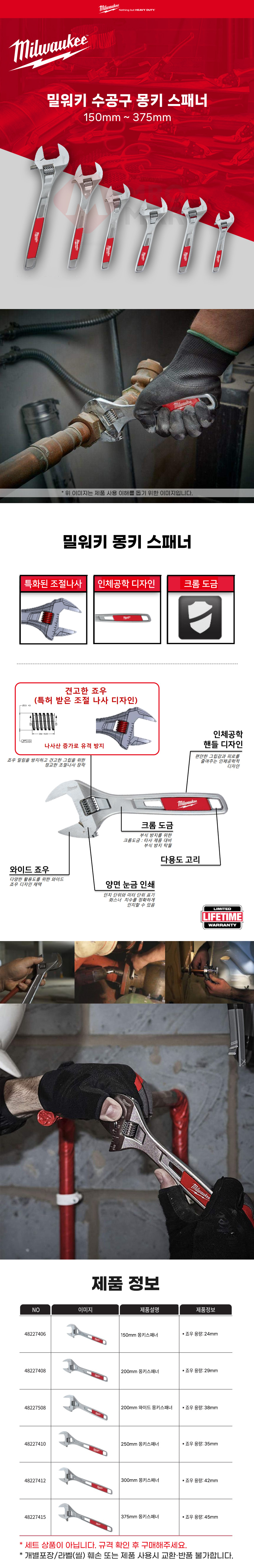 밀워키 8인치 와이드 몽키 스패너 48-22-7508A 조절형 경량 렌치 수공구 배관 수전