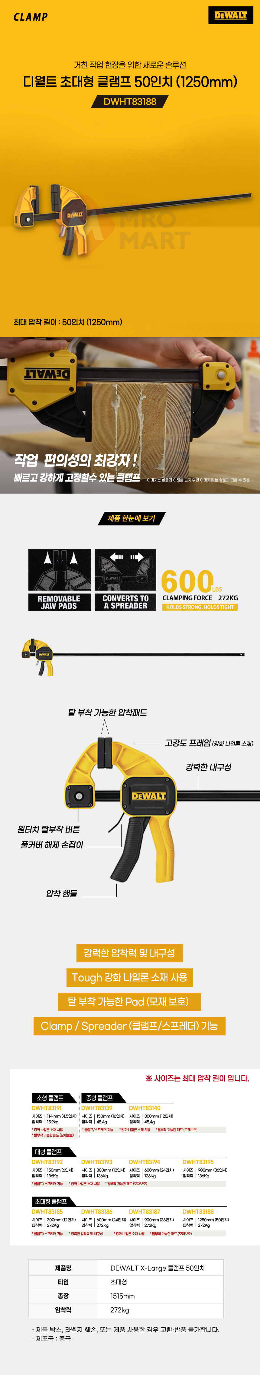 디월트 목재 목공용 초대형 트리거 클램프 50인치 1250mm DWHT83188 (2개입)