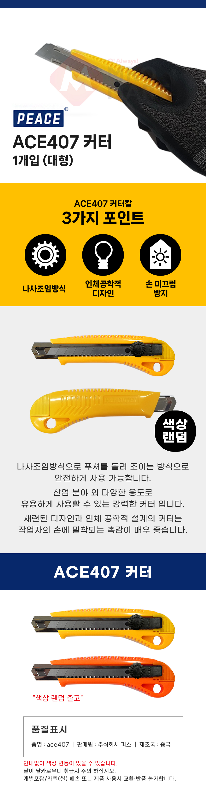 피스 ACE407 커터 대형 커터칼 컷터칼 공업용 사무용