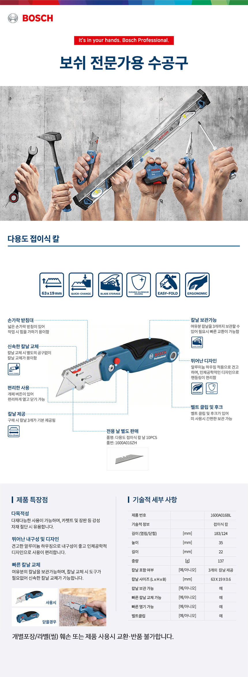 보쉬 다용도 접이식 칼 1600A016BL 커터 캇타 나이프 공구 캠핑 등산 작업