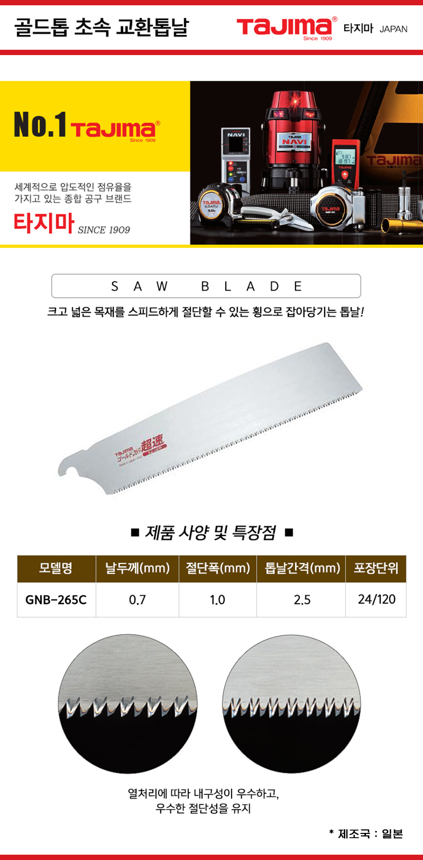 타지마 골드톱 초속 교체 교환 톱날 GNB-265C 목재 합판 원예 톱 목공 수공구