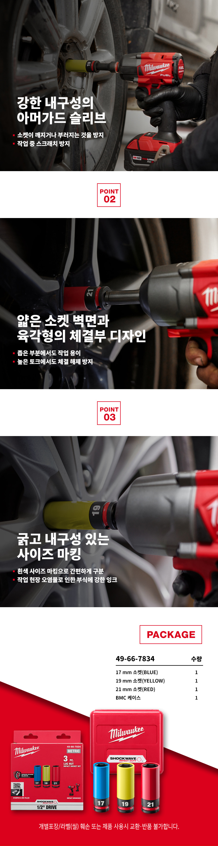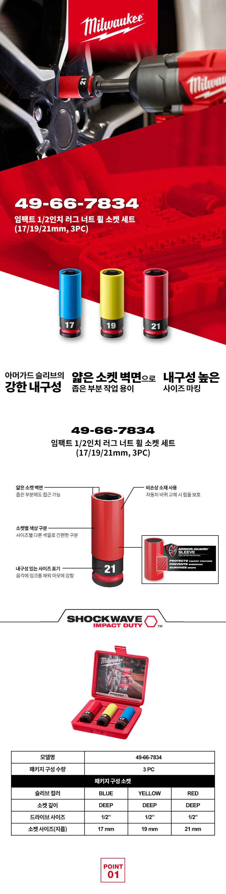 밀워키 49-66-7834 임팩트 1/2인치 러그 너트 휠 소켓 세트 17 19 21MM 3PC 복스알 복스 롱 소켓