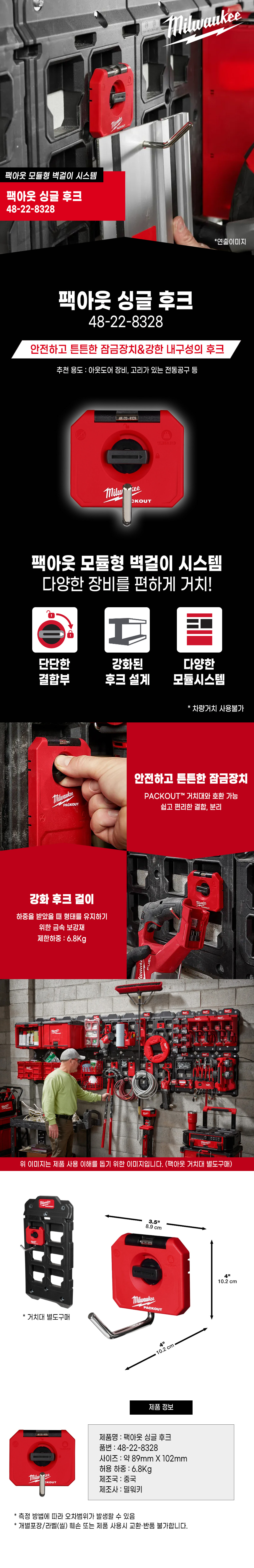 밀워키 팩아웃 싱글 후크 48-22-8328 수공구 공구 걸이 벽걸이 정리 고리