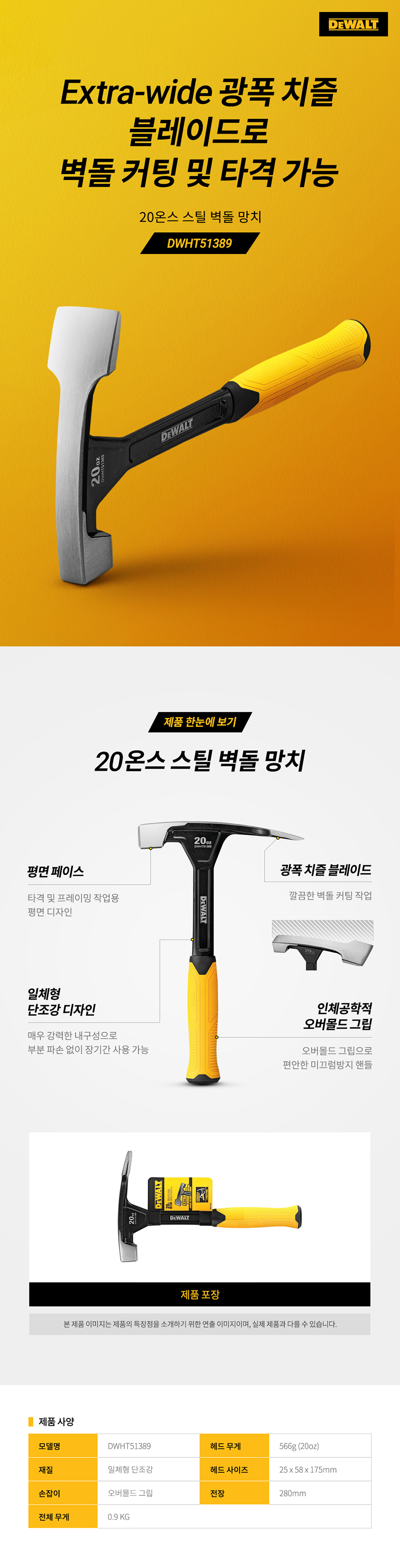 디월트 DWHT51389 20온즈 스틸 벽돌 망치 해머 빠루 장도리 수공구