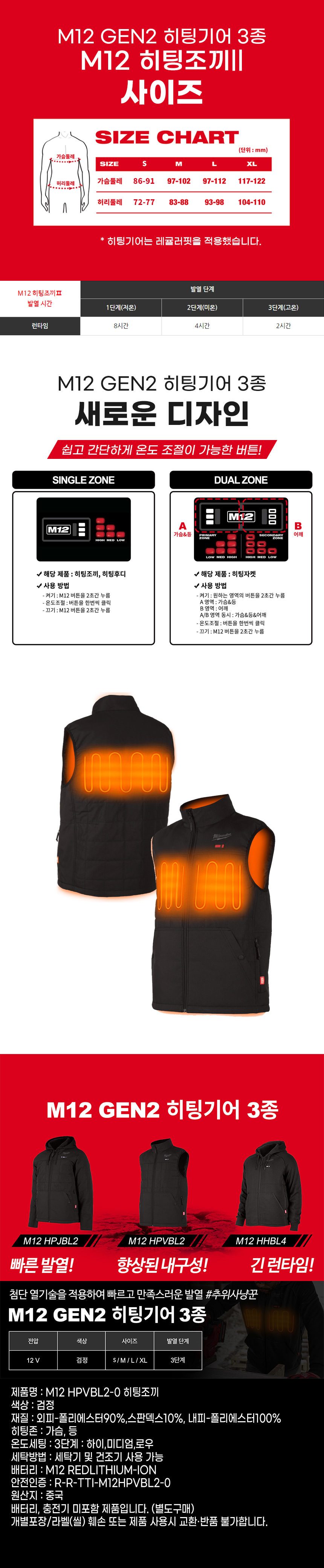 밀워키 12V 히팅 조끼 M12 HPVBL2-0 베어툴 발열 열선 보온 베스트 작업복