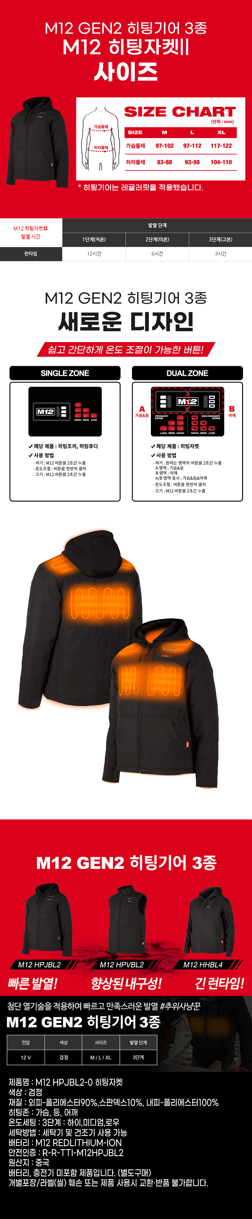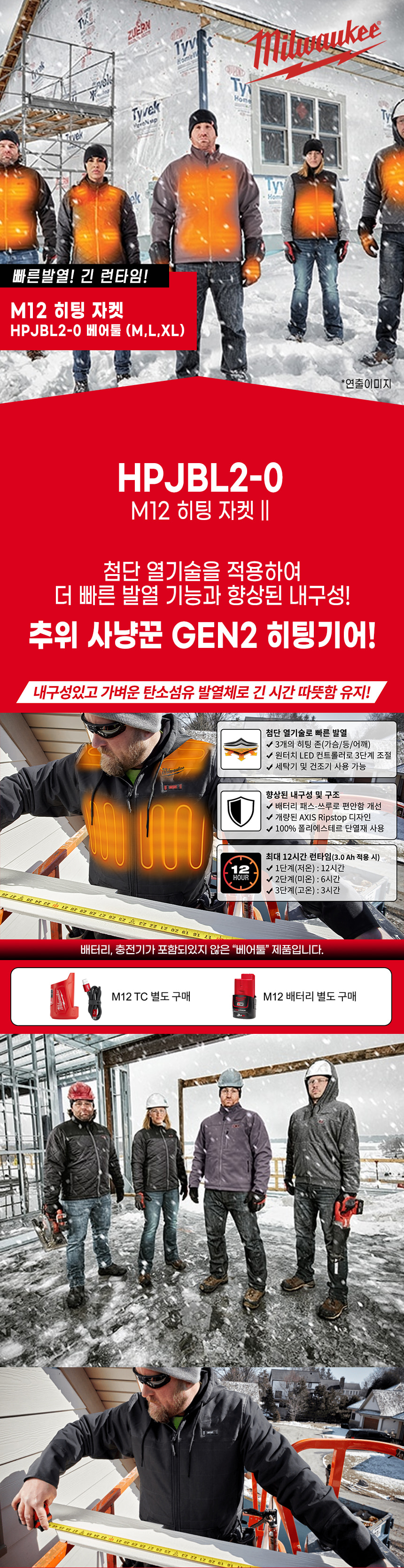 밀워키 12V 히팅 자켓 M12 HPJBL2-0 베어툴 발열 열선 보온 잠바 작업복