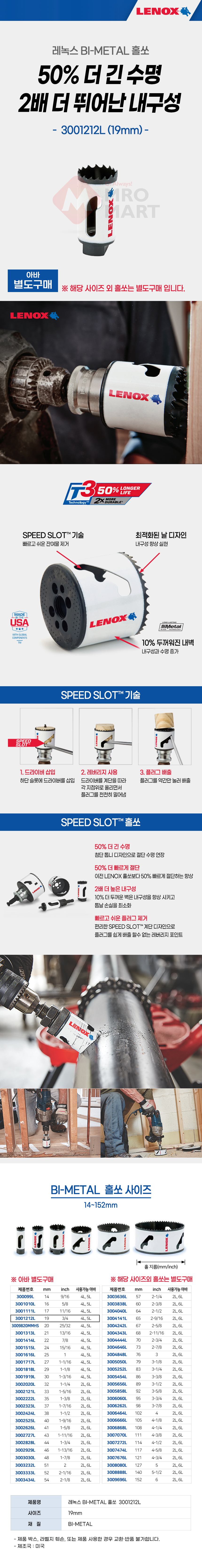 레녹스 3001212L 바이메탈 홀쏘 홀컷터 철공용 목공용 19mm