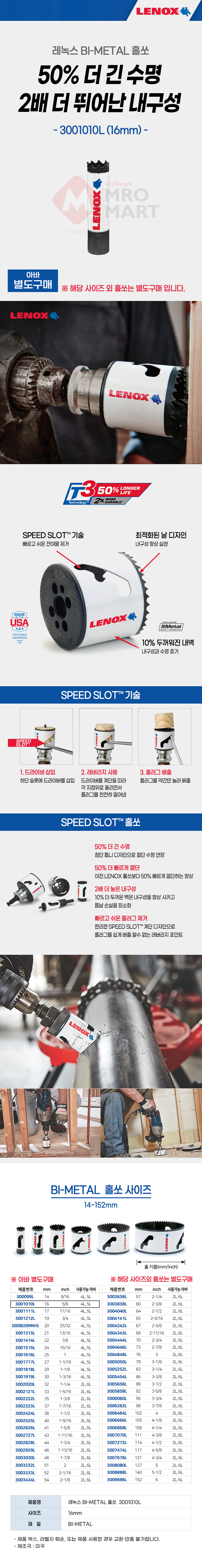 레녹스 3001010L 바이메탈 홀쏘 홀컷터 철공용 목공용 16mm