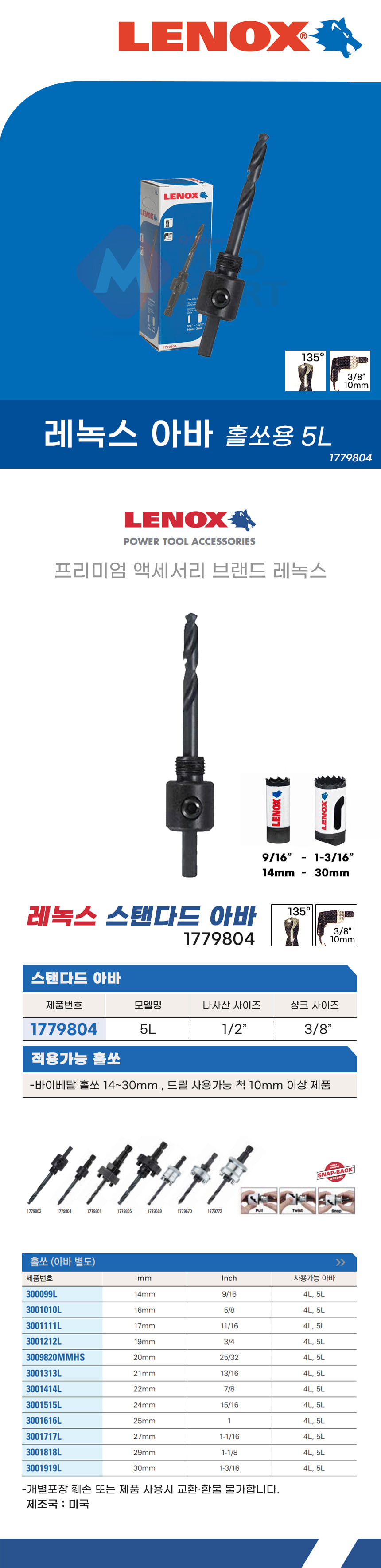 레녹스 아바 1779804 스탠다드 5L 홀쏘 홀커터 드릴 육각샹크