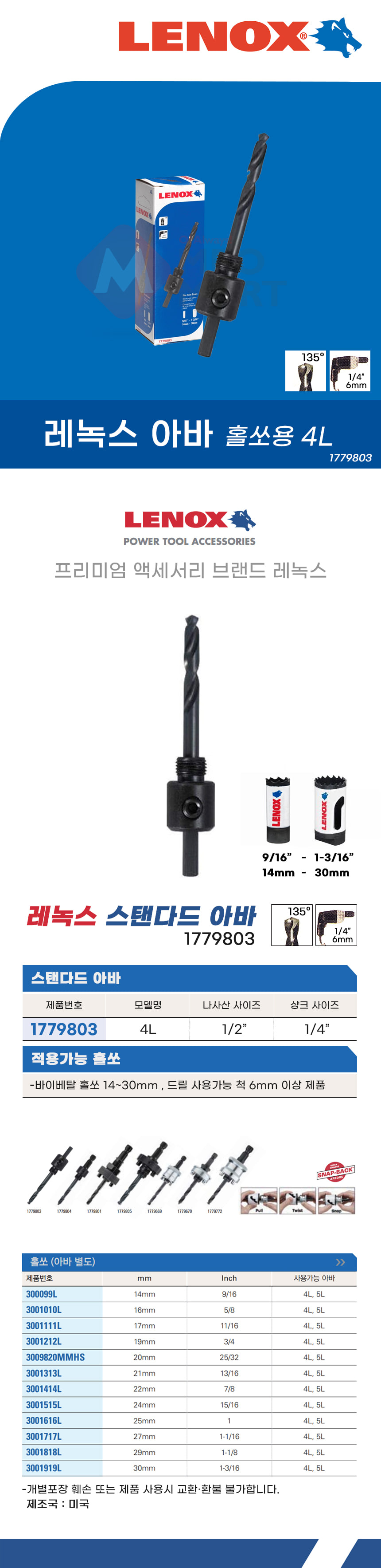 레녹스 아바 1779803 스탠다드 4L 홀쏘 홀커터 드릴 육각샹크