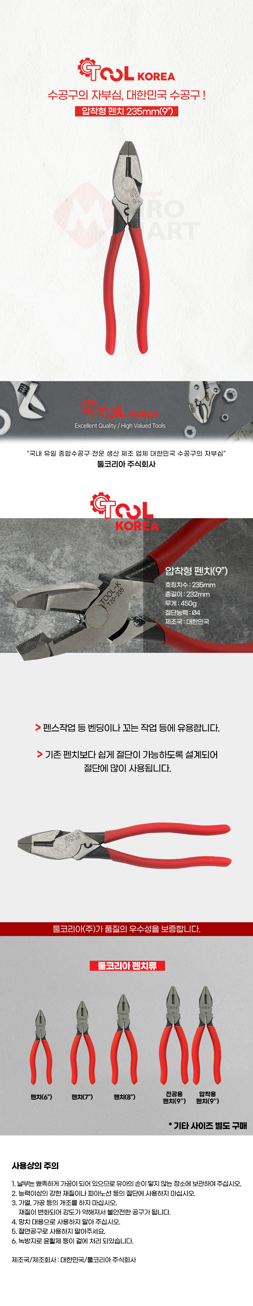툴코리아 압착형 펜치 235mm 9인치
