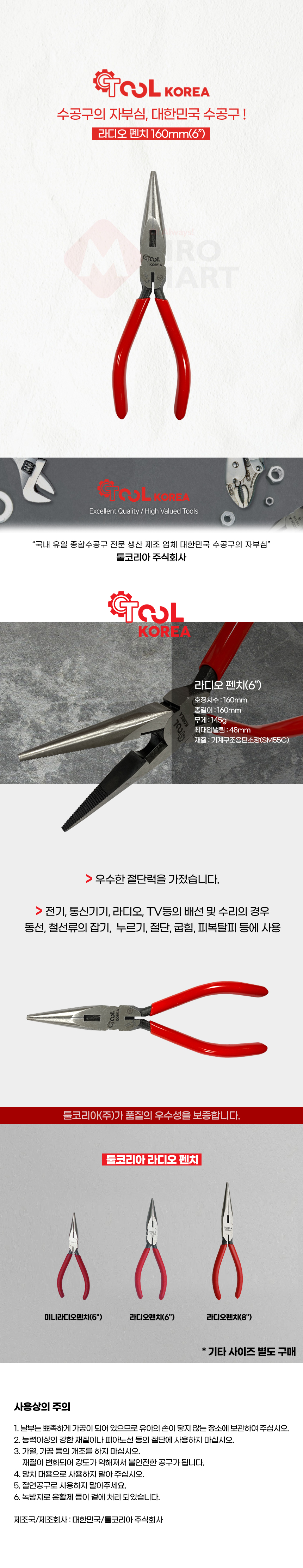 툴코리아 라디오 펜치 160mm 6인치 국산 수공구 뺀치 압착 절단
