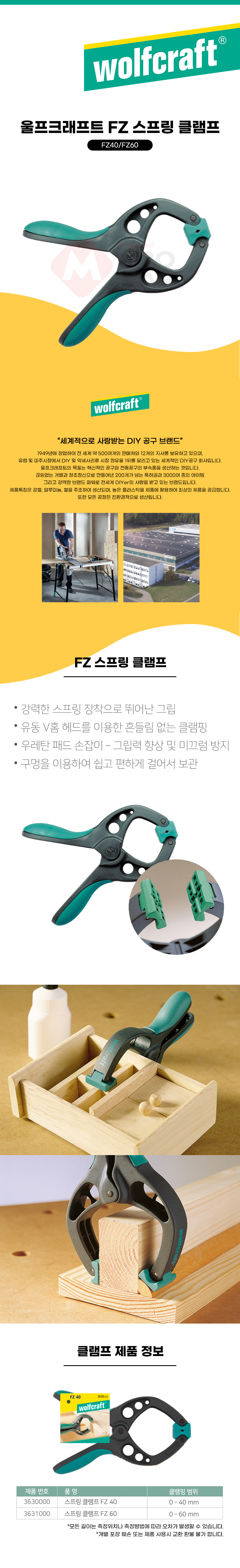 울프크래프트 FZ40 스프링 클램프 3630000 40mm 집게 고정기 바이스 고정 모서리 목재 목공