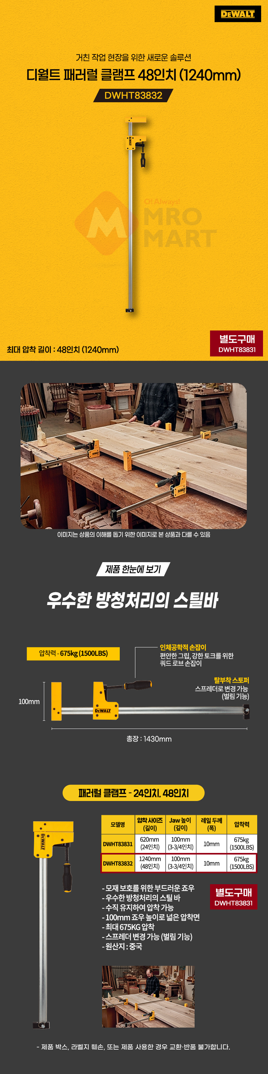 디월트 DWHT83832 패러럴 클램프 48인치 1240mm 목재 목공 고정 (2개입)