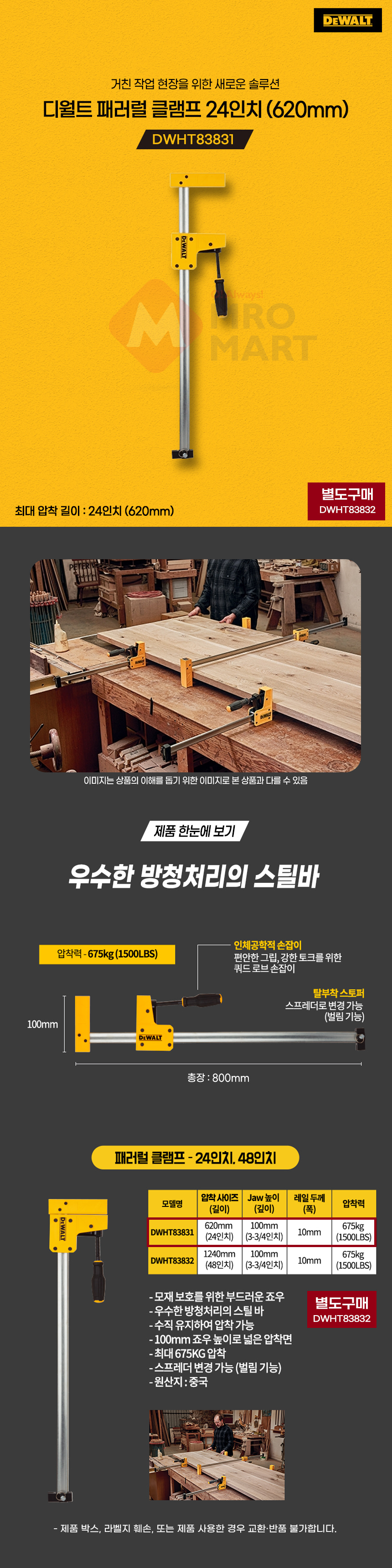 디월트 DWHT83831 패러럴 클램프 24인치 620mm 목재 목공 고정