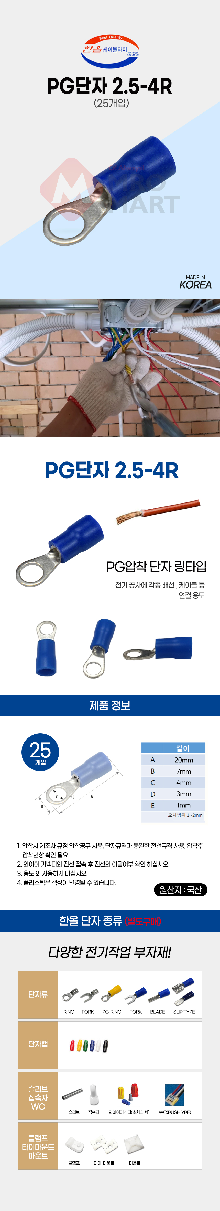 한올 PG단자 2.5-4R 25개입 링타입 압착 터미널 전기 전선 연결