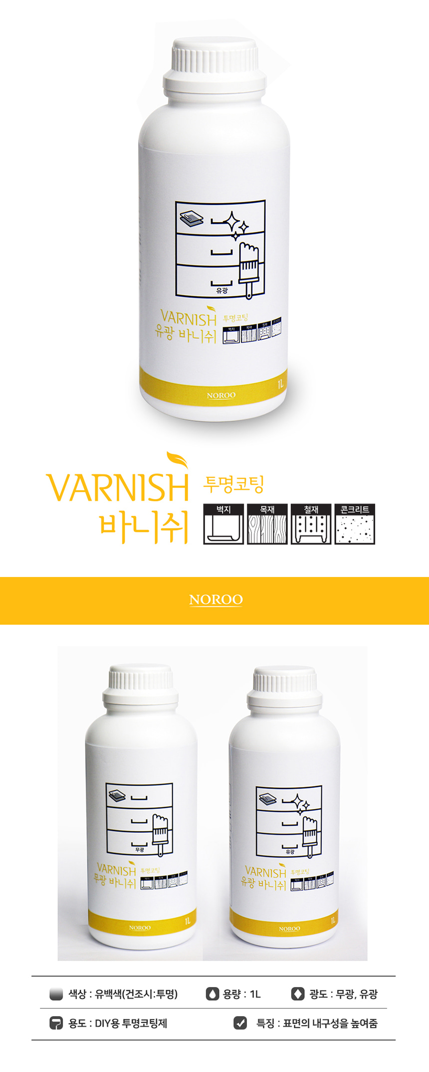노루페인트 노루표 수성 바니쉬 1L 유광 무광 투명 코팅 마감 벽지 원목 목재 철재 콘크리트