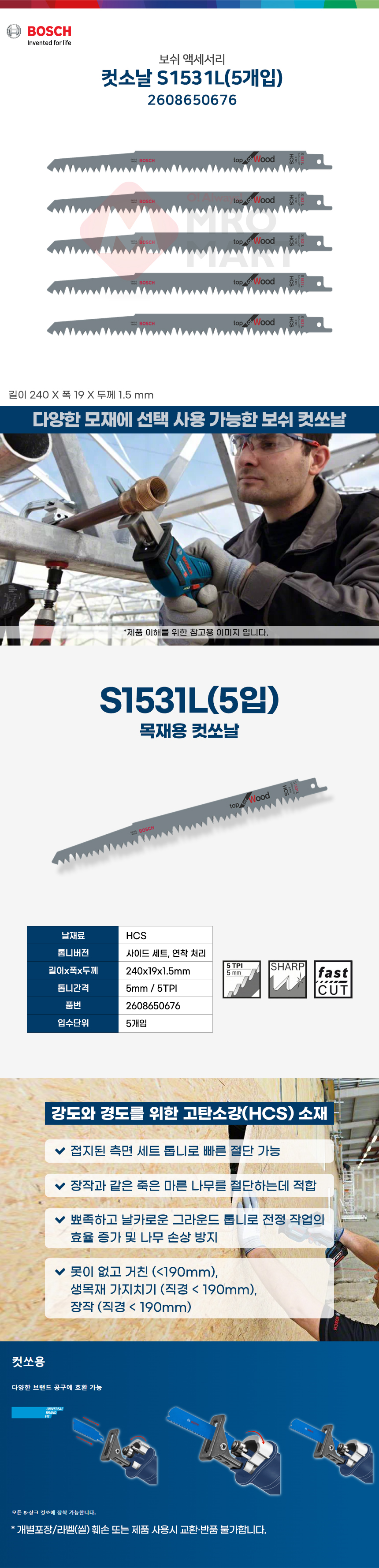 보쉬 컷쏘날 세트 5개입 S 1531 L 240mm 2608650676 목재 컷소날 커팅날 교환날 절단 컷팅 톱