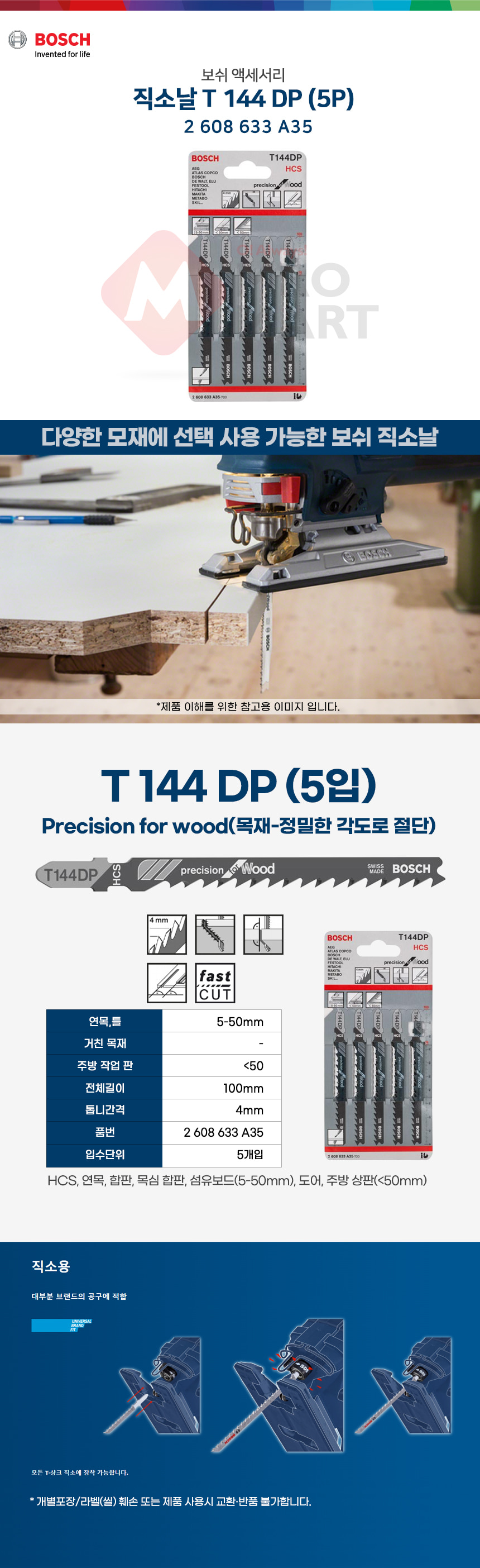 보쉬 직소날 T 144 DP 5개입 2608633A35 직쏘날 목재 나무 합판 주방 상판 100mm HCS
