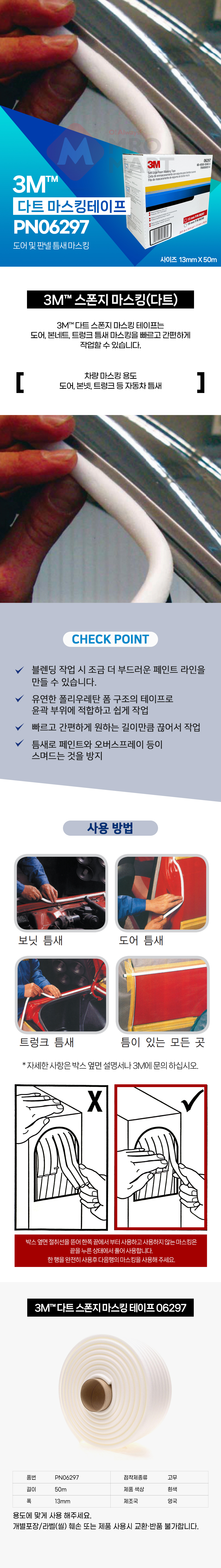 3M PN6297 다트 스폰지 마스킹 테이프 13mmX50M 소프트 폼 도어 본네트 틈새 페인트 도장 작업