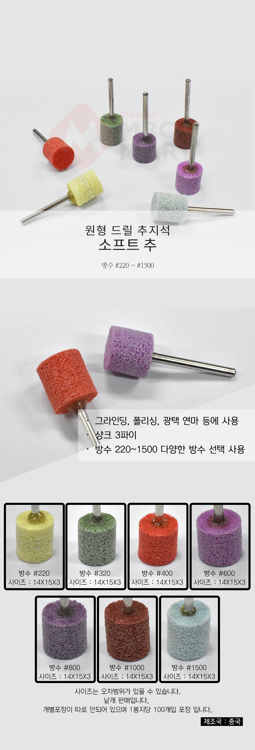 소프트추 800방 14x15x3 드릴 원통 연마 샌딩 사포 추지석 광택 연마
