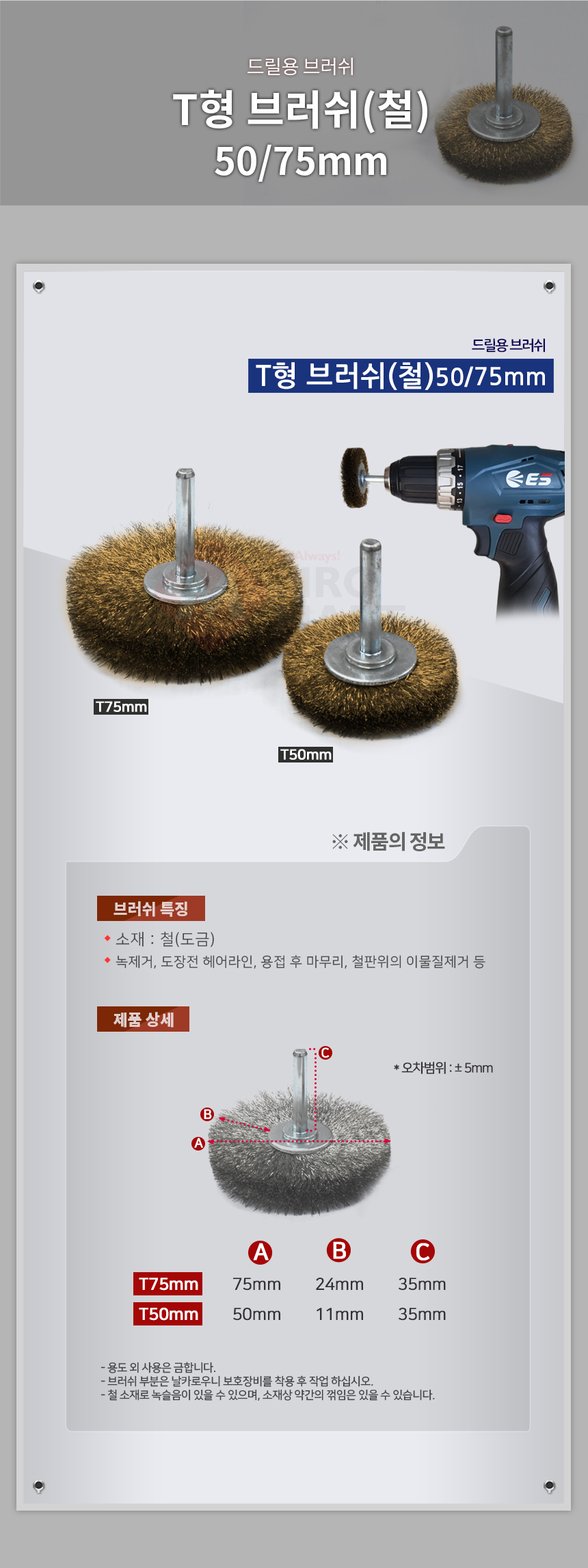 T형 철 브러쉬 브러시 50mm 드릴용 평브러쉬 강판 녹 이물질 제거 용접 마무리