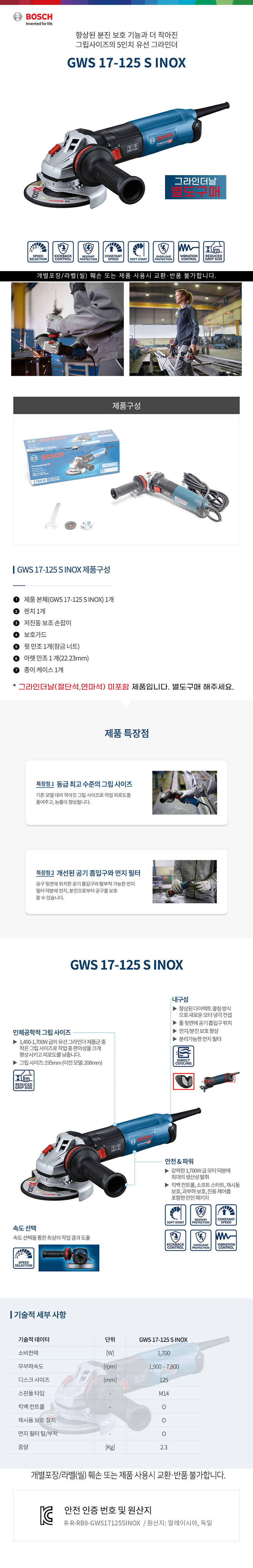 보쉬 GWS 17-125 S INOX 5인치 유선 앵글 그라인더 06017D05B0 속도조절 절단 연삭 연마