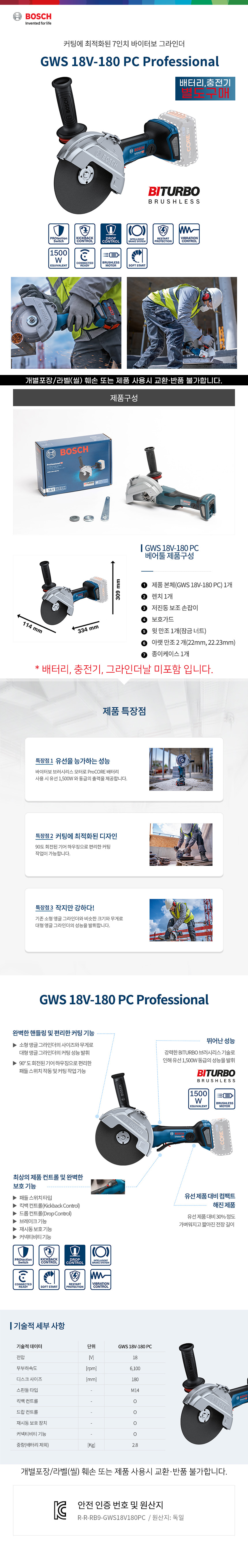 보쉬 GWS 18V-180 PC 충전 7인치 바이터보 앵글 그라인더 베어툴 06019H6EB1 컷팅 절삭