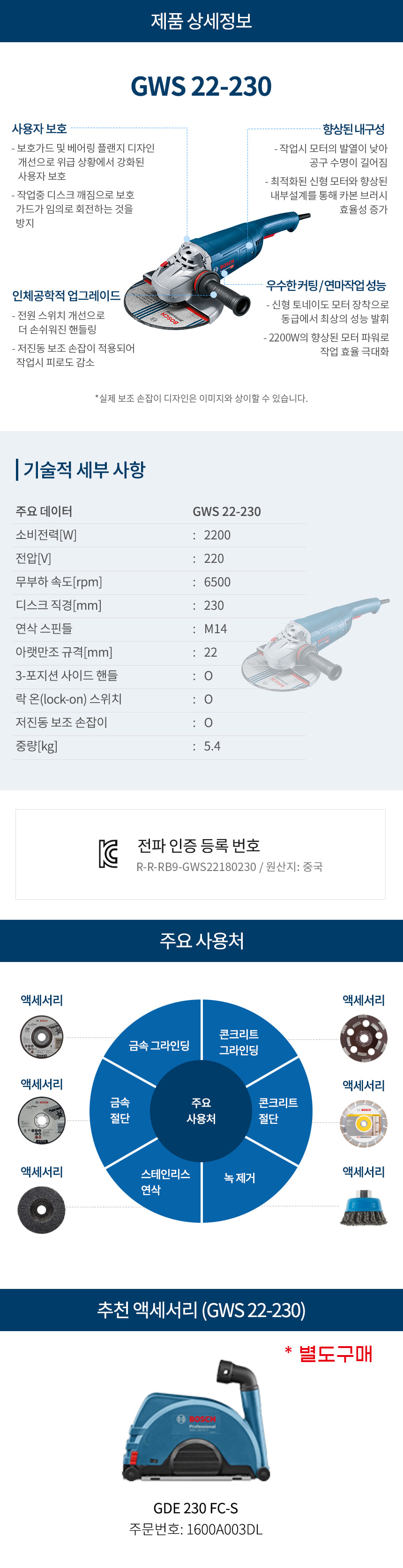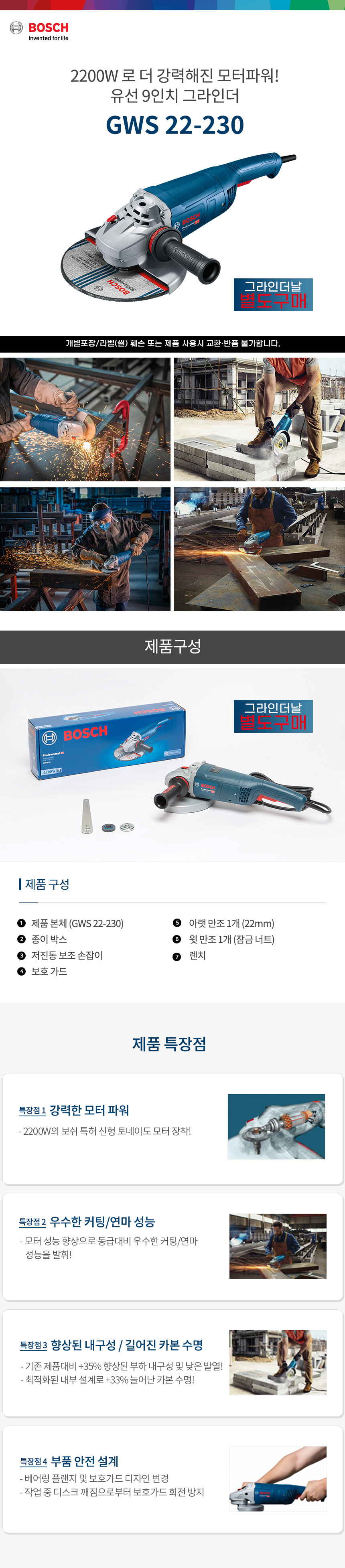 보쉬 GWS 22-230 2200W 9인치 유선 전기 앵글 그라인더 06018C10B0 유선 절단 연삭 연마