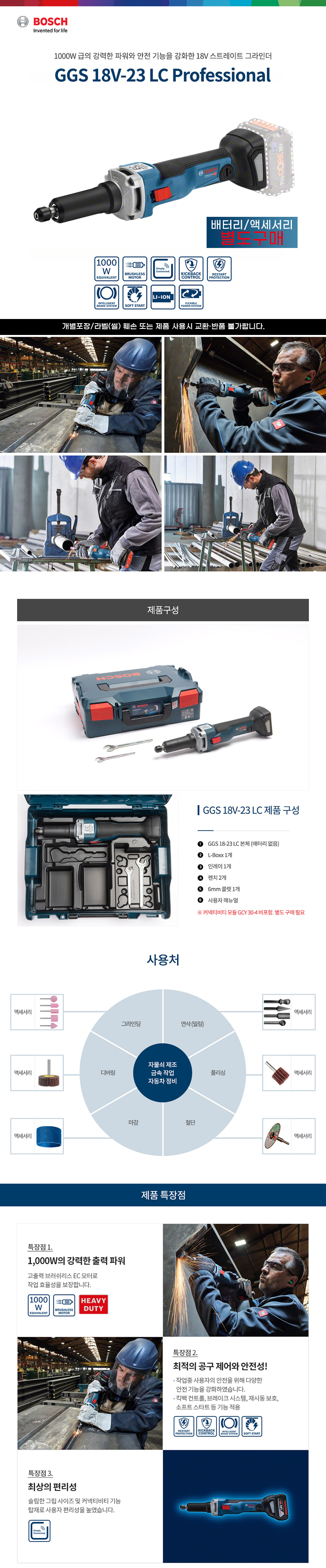 보쉬 GGS 18V-23 LC 충전 스트레이트 그라인더 베어툴 06012291B0 연마 연삭 롱형