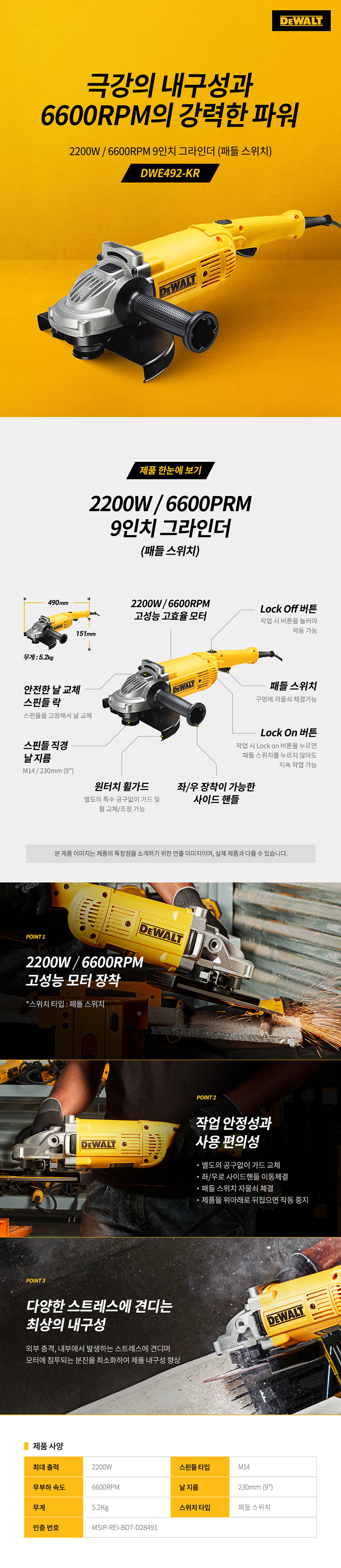 디월트 DWE492 유선 전기 2200W 9인치 대형 그라인더 절단 절삭 공구