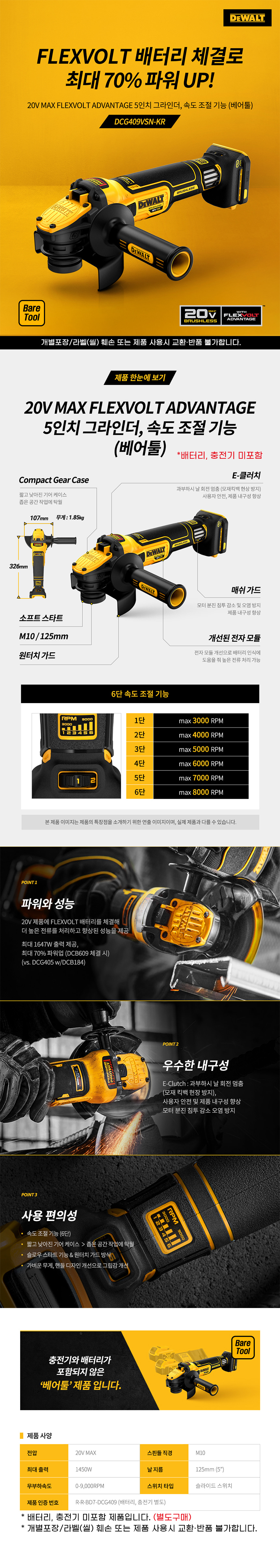 디월트 20V MAX FLEXVOLT Advantage 충전 5인치 그라인더 베어툴 DCG409VSN 속도조절