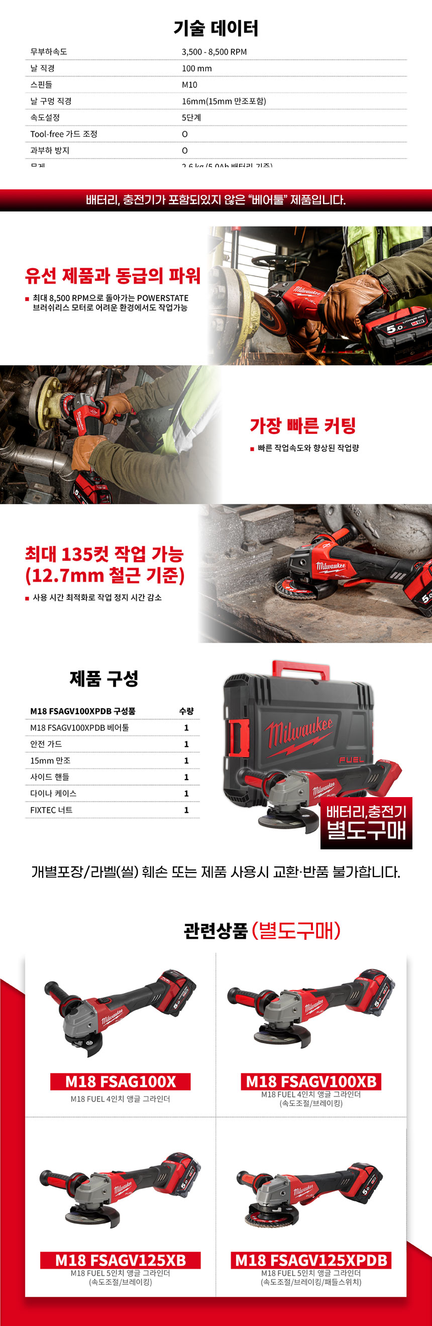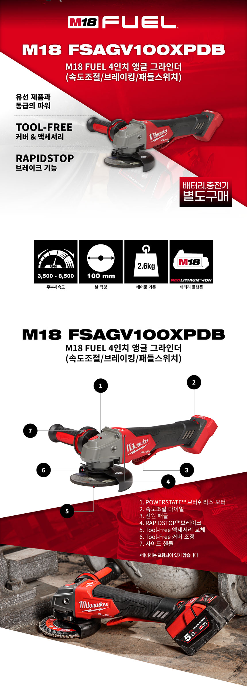 밀워키 M18 FSAGV100XPDB-0X0 18V FUEL 충전 4인치 앵글 그라인더 베어툴 속도조절