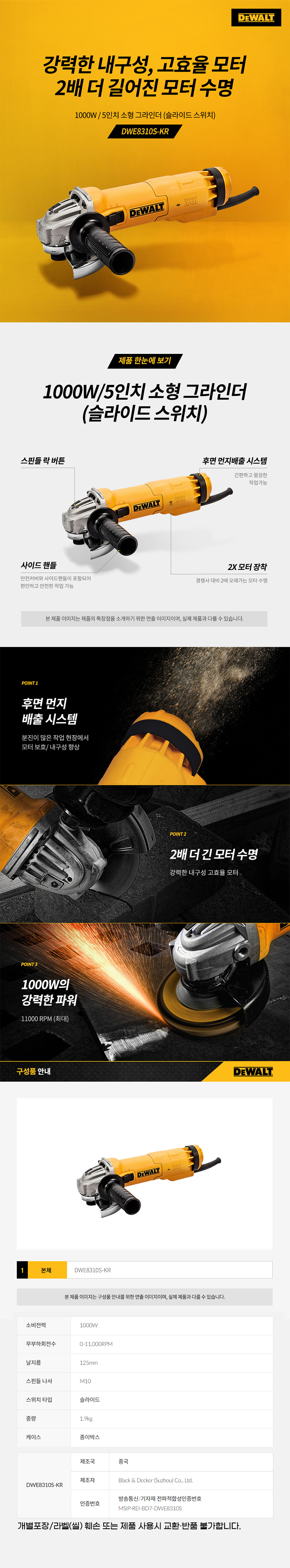 디월트 1000W 5인치 소형 전기 앵글 그라인더 DWE8310S 철재 절단
