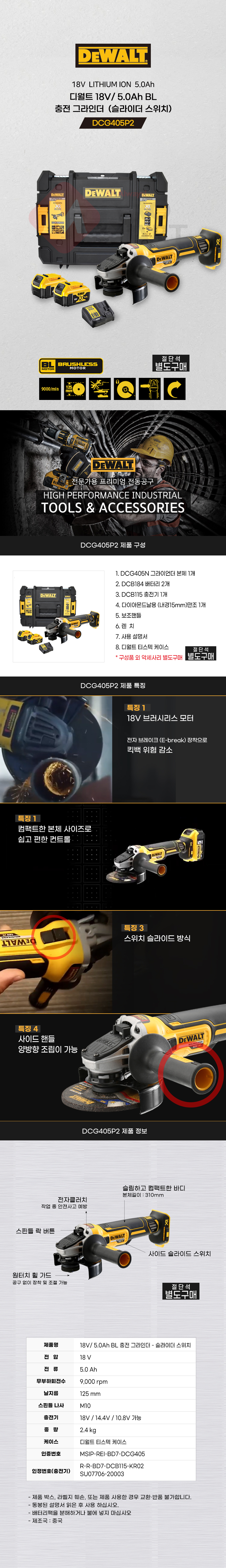 디월트 18V 5.0Ah BL 충전 그라인더 슬라이더 스위치 DCG405P2