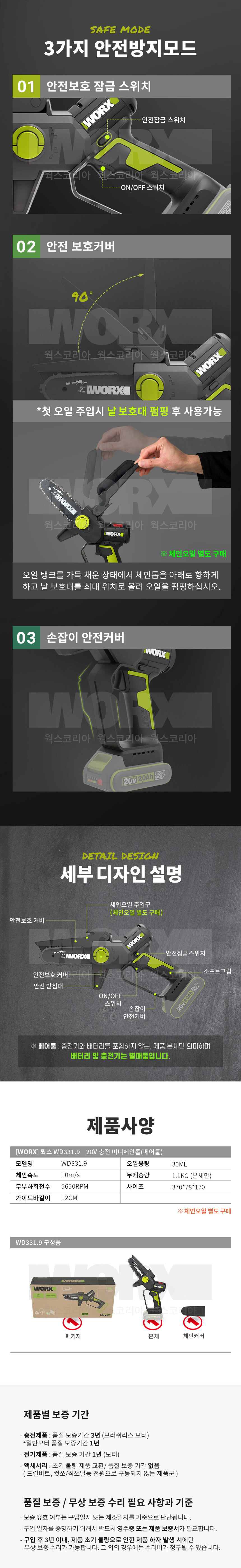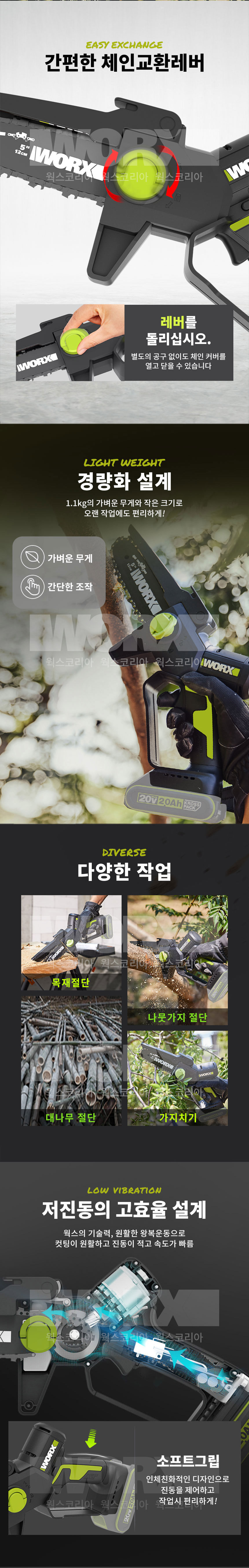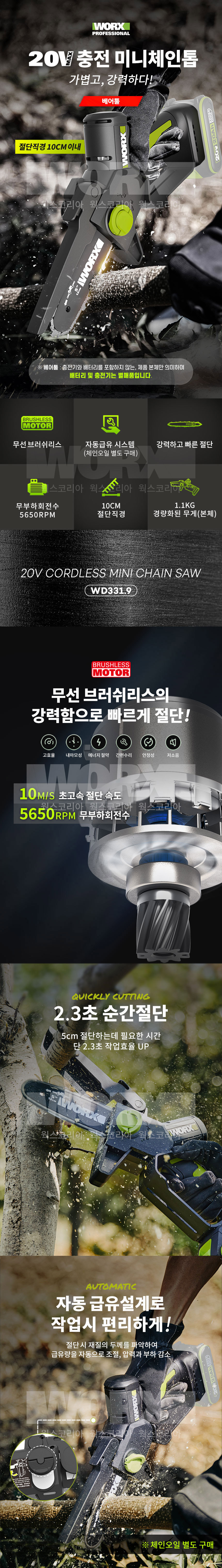 웍스 WD331.9 충전 20V 전동공구 미니 체인톱 베어툴