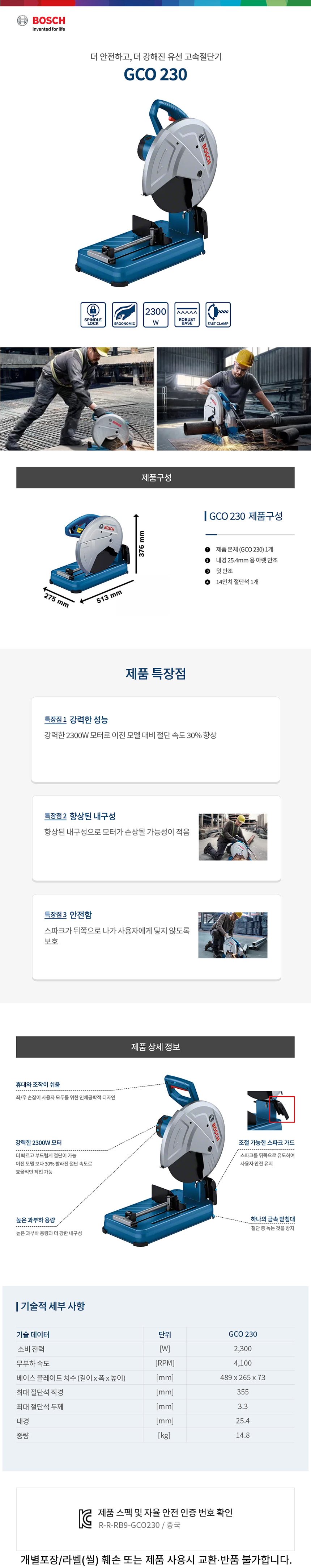 보쉬 GCO 230 2300W 255mm 유선 고속 금속절단기 0601B560B0 철재 금속 절단 컷팅기
