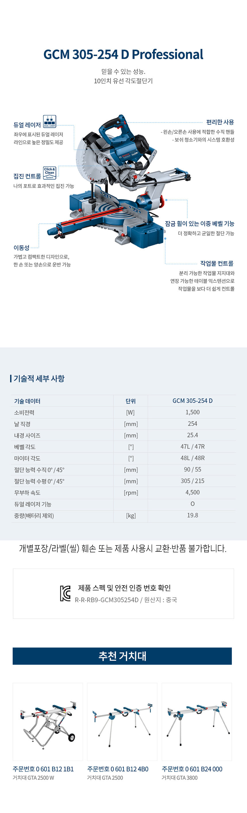 보쉬 GCM 305-254 D 10인치 유선 글라이딩 각도 절단기 0601B491B0 컷팅기 절단 1500W