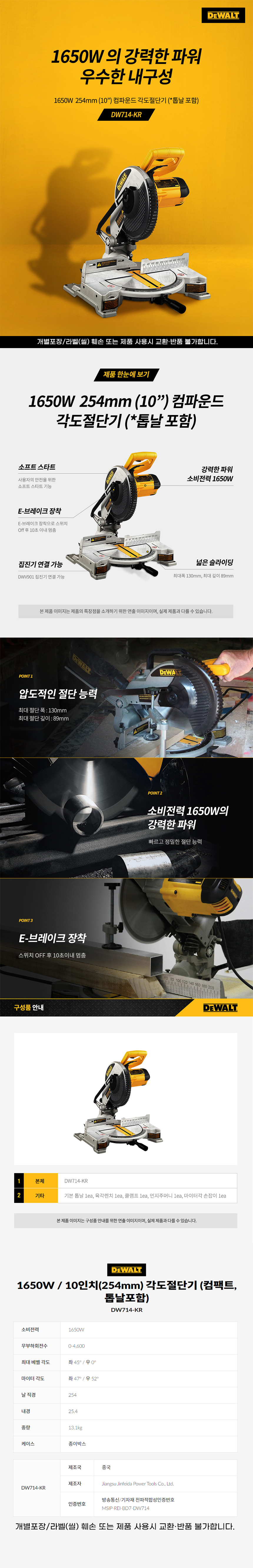 디월트 1650W 10인치 254mm 전기 각도 절단기 DW714 컴팩트 톱날포함 유선 목재 컷팅