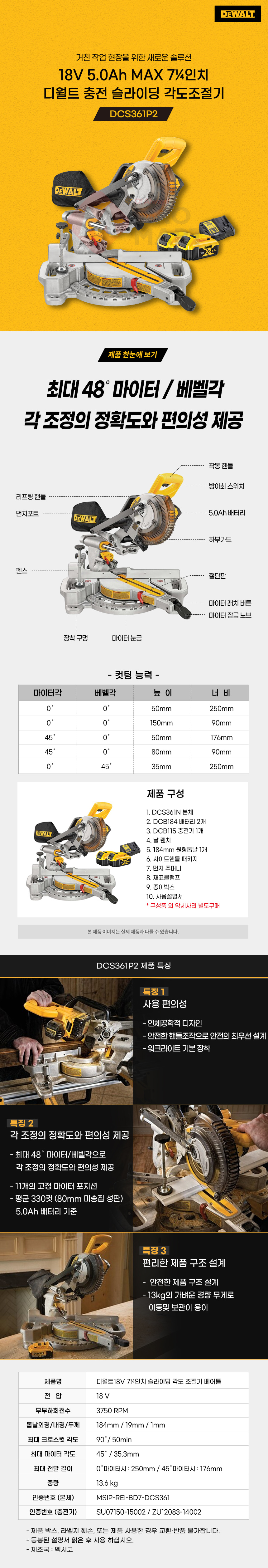 디월트 DCS361P2 충전 슬라이딩 각도 절단기 배터리 세트 18V 5.0Ah 컷팅기 각도톱