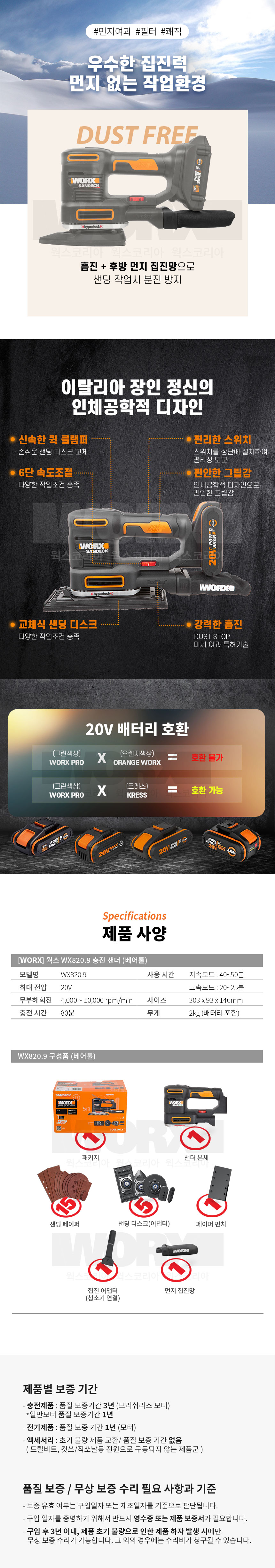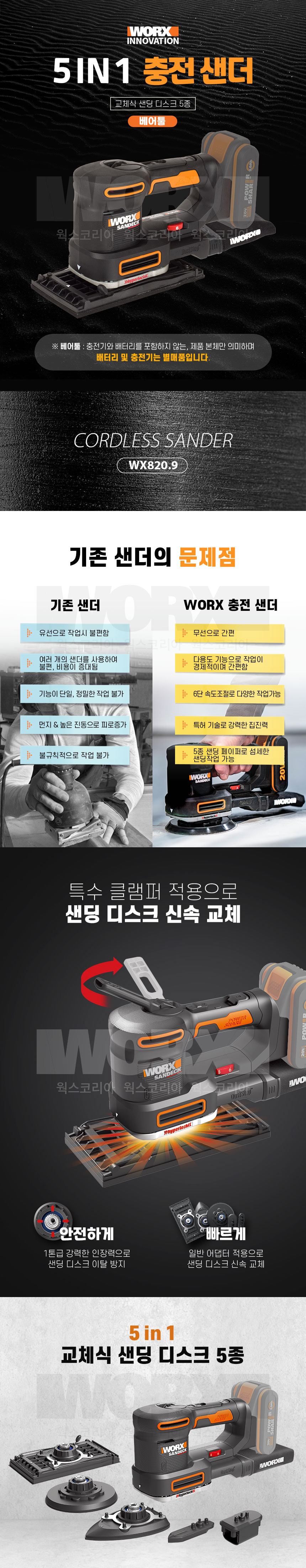 웍스 WX820.9 충전 20V 샌더 샌딩기 무선 디스크 5종 포함 베어툴 배터리 충전기 미포함